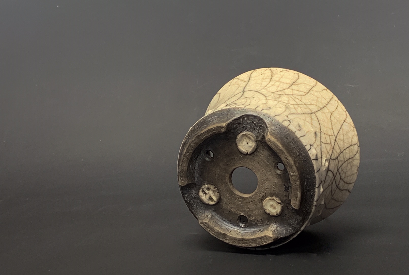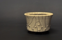 “This is a thrown round drum pot with an off-white crackle glaze. The primary crazing is quite large on this pot but it also has smaller detailed cracks highlighted with the carbon from the reduction part of the raku firing”